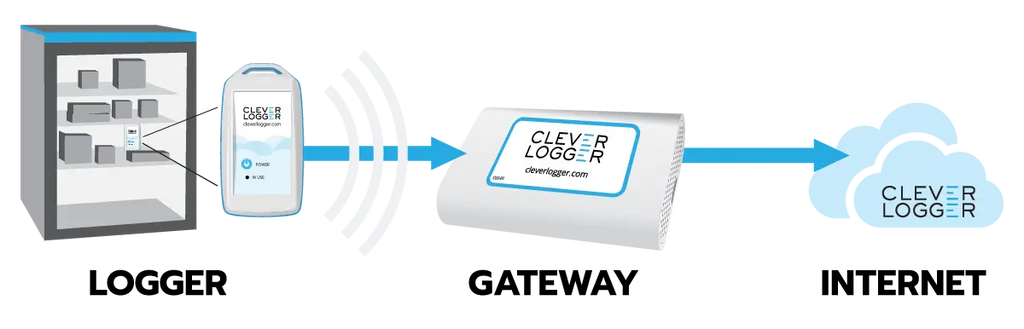 Traditional loggers have to be manually downloaded to get their data. Clever Logger changes that. The loggers broadcast their readings electronically. The gateway receives the readings and saves them to the internet every few minutes.